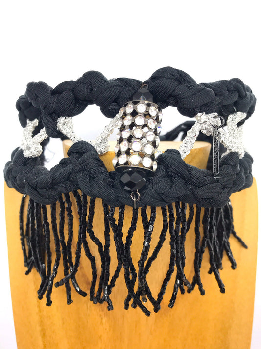 Black and silver glittery choker - wire crochet with black beaded tassels, irregular eco friendly statement accessory