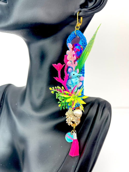 Aquarium earrings 4 (Cute seahorse/Blue octopus neon yellow tassels)