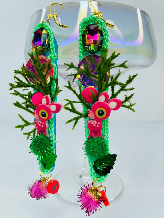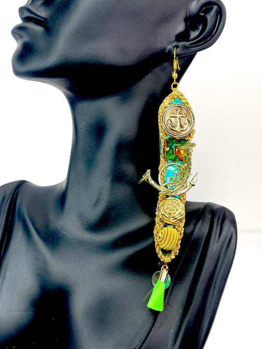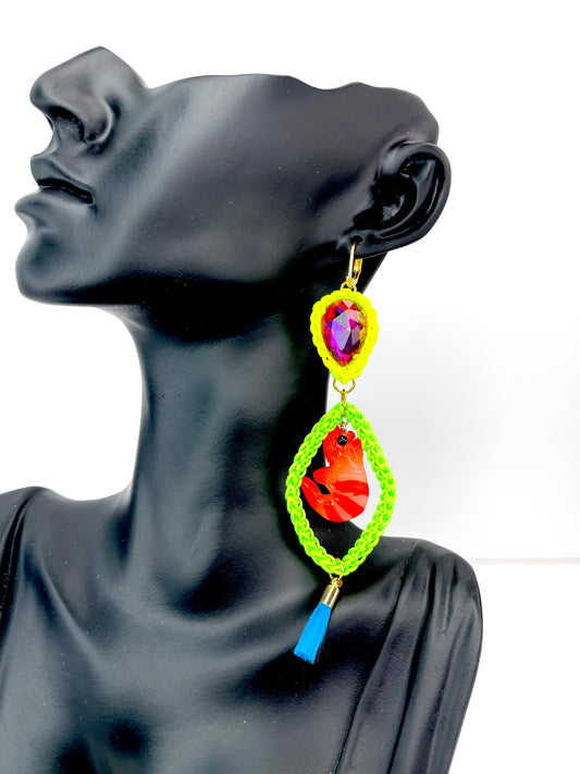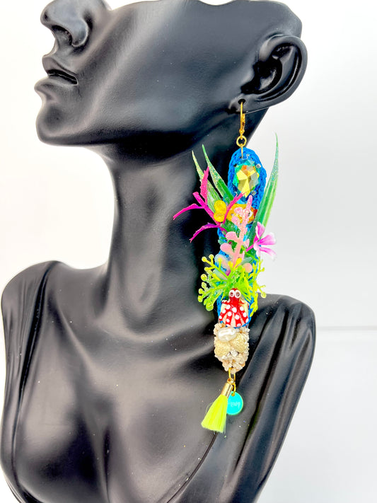 Aquarium Earrings 7 (Realistic seahorse and red spotty octopus neon green tassels)