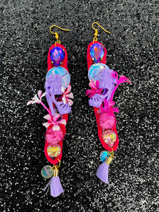 Aquarium earrings 9 (Realistic seahorse with red spotty octopus and neon pink tassels)