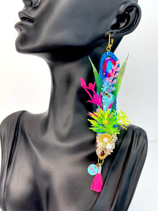 Aquarium earrings 8 (Realistic seahorse and blue octopus with neon orange tassels)